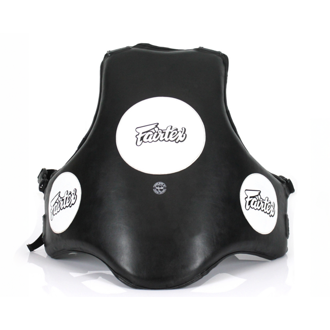 Het harnas is vervaardigd uit duurzaam Fairtex Syntek™ kunstleer en gevuld met een dikke multi-layer foamconstructie die zware impact efficiënt absorbeert. Hierdoor blijft de trainer beschermd tijdens explosieve combinaties en knietechnieken, terwijl de witte targetzones een duidelijk focuspunt vormen voor nauwkeurige techniektraining.